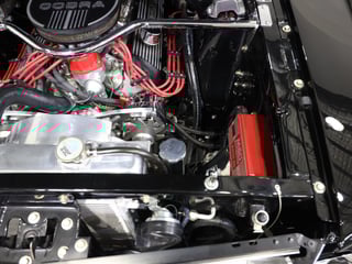 With the running gear, Classic Speed opted for a new, high performance balanced and blueprinted 302/347 Windsor Stroker crate engine with flat top pistons, hydraulic roller camshaft, double row timing chain, CNC aluminium cylinder heads with oversized inlet and exhaust valves, a 4-barrel manifold matched to a 600 CFM Holley carburettor with MSD Electronic CDI ignition and Serpentine belt drive kit. An enlarged oil pan has been fitted and full length stainless steel headers are connected to a new 2 1/4’’ performance exhaust system. A polished radiator with custom thermal clutch fan and custom aluminium fan shroud and Black finned Shelby insignia valve covers complete the picture.