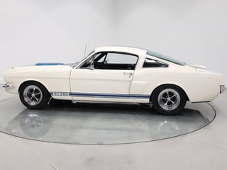 The car has been built from a very nice '65 Fastback body some years ago, and presents superbly in Wimbledon White with Guardsman Blue stripes done to original GT350 Shelby specifications.