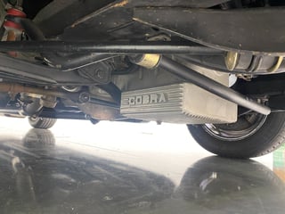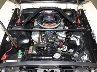 Breathing through correct Shelby style Tri-Y headers, and nice 2 1/4" dual system with Gibson mufflers. Engine also features a correct large pulley alternator, and is dressed with correct Shelby rocker covers and finned alloy sump. Cooling is managed by a correct radiator, cowl and Hi-Po engine fan. The engine bay also features the correct export brace and plenum support.