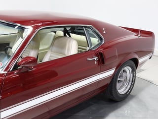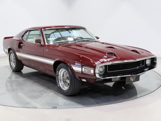 When the purchaser of this magnificent Royal Maroon/ White Knitted Vinyl Shelby Mustang visited his local Ford Dealer, Bob Rice, Ford in Boise, Idaho he ticked a very important option on the Ford Dealer's order form. He selected the 428 power plant for his Mustang and with that came the unique Shelby fiberglass front end, the five NACA air ducts adorning the composite hood, Thunderbird style rear tail lights, GT500 side stripes and that awesome centre exhaust.