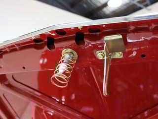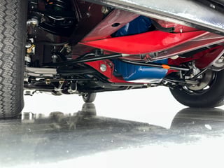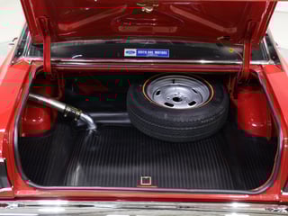 Riding on genuine riveted 5 slot rims with concours caps, dress rims and red walled Aquatread Sport 205/70R14 tyres. New 36 gallon fuel tank, spare wheel tie down and fuel line breather hose. Red wall Aquatread and 5 slot spare.