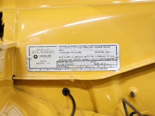 Price: $264,500 VIN: VH7S29/BH29-0208 Paint: YC Berg 4485 Trim: X1 Options: G60 - Quarter Vent windows (Delete Pop Out Rear Windows) as noted on the Valiant Infobase database J82 - Homologated for Racing E38 (As noted on the Valiant Infobase database) A84 - Track Pack including large fuel tank, 16:1 steering box, 14x7 alloys and heavy duty discs and hubs. A95 - Interior dress up package, reclining buckets, carpets and 3 spoke wheel E38 - 265 cubic inch 6 cylinder Hemi head 6 barrel induction, special camshaft competition engine (280bhp) D53 - Suregrip rear axle 3.23:1 Build: 8-1971