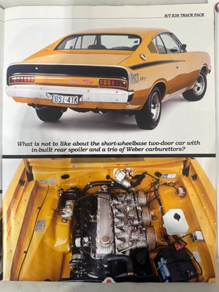 As with Ford's XY Falcon GTHO Phase 3 and Holden's LJ Torana GTR XU-1, Chrysler built a limited number of E38 R/T Chargers in order to homologate the modifications made to the standard R/T Charger so that Chrysler could participate in the lucrative Touring Car Series which culminated in the 1971 Hardie-Ferodo 500 at Bathurst on October 3, 1971. According to the Valiant Infobase, 316 E38 R/T Chargers were built with 224 factory optioned with the Bathurst long range fuel tank known as the Track Pack or Option 84. This option specified the 35 gallon 160 litre Bathurst tank strapped purposefully into the boot, a no-nonsense effort by Chrysler engineers to keep the big Valiant out on the race track for longer stints. Fitted with those awesome looking twin external fillers for faster fills, the Big Tank E38 is all class. The A84 option also spec'd the E38 with a 16:1 ratio steering box, 14x7" W35 ROH alloy wheels and heavy duty discs and hubs. Additionally the J82 Homologation for Racing option cars were fitted with the G60 Quarter Vent window option designed to force cool air towards the racing driver.