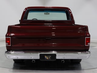 The body was completely separated from the chassis before being prepped for paint. Any necessary repairs were made before the truck was completely repainted inside and out in a deep metallic burgundy. Even the inside of the tub is gloss painted to match the outside. The chrome bumpers, front grille, lights and badges were all either refinished or replaced. And the good looks are complimented by the 20” polished American Racing Wheels.