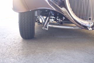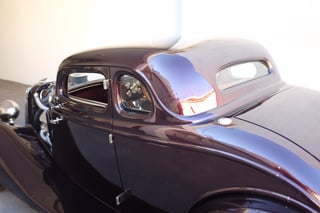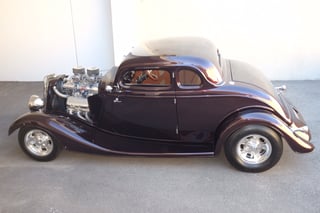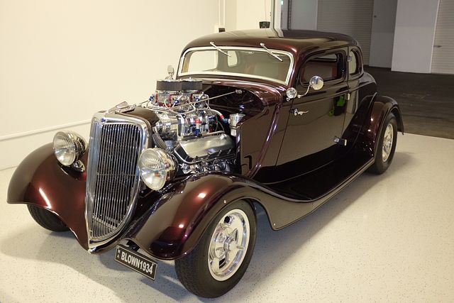 Coca Cola pre-mix special one off colour Ford 1934 5 window coupe. Duce Farm, NZ glass body nut and bolt built in Perth. Running a big block Chev 454 with 871 blown supercharger, twin 750 Quick Fuel carbies, aluminium Edelbrock heads, SRP forged pistons, steel crank, Scat H beams, MSD ignition and custom fully polished HPC stainless headers and exhaust. Turbo-400, TCI converter with stall and 9" LSD 31 spline Billet axles and 3.9:1 gears. Full leather custom trim, Billet steering wheel and tilt column, pro rachet shifter and VDO gauges. 4" dropped I beam, triangulated four bar rear end. Fully engineered and registered in WA. Over $200,000 spent on build in 2013 and done 1,000 Klm since build. Featured in Street Machine Hot rod magazine ed. 10. BLOWN1934 plates for WA buyer. Perth car. (Ref. 4402)
