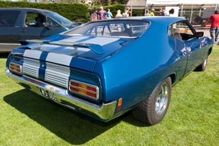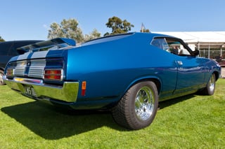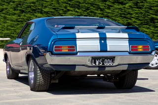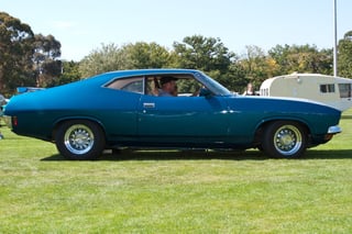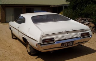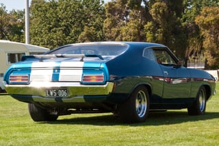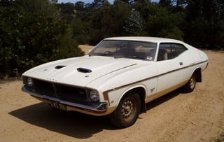 Stunning 3 year rebuild on two owner 1974 XB GS Falcon Coupe. Restored in 2010 in Apollo blue/Arctic silver with original Chamois trim. 351 Cleveland, Genie extractors & side pipes, Warm Crow cam and Roller rockers. Dual plane manifold & new 650 Holley, C10 auto with shift kit and 2500 stall converter. Custom 7" & 10" chrome 12 slotters. 1,300 miles since rebuild. No expense has been spared build. Log books, service history and 103,800 miles from new. Ararat, Victoria car.