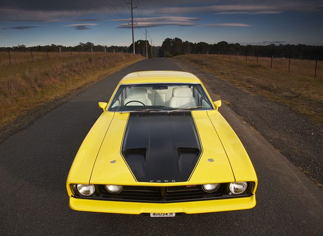 Heavily optioned factory yellow blaze and white trim XB GT Falcon. Bare metal restored in 2004 and retimmed in the factory white trim. All matching numbers car with fully rebuilt 2V 351 Cleveland with mild cam and factory top loader. Excellent body and paint. Factory A/C, power windows and eight track. Rare standout colour combo car. Sydney car.
