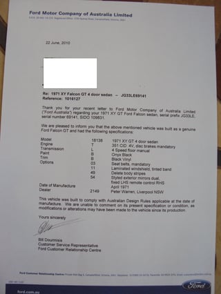 One-off genuine Onyx black XY GT Falcon. Peter Warren's (Peter Warren Ford, Liverpool) personal car. Stunning Onyx Black/black trim GT and the only 4 speed manual black XY GT built. Peter Warren fitted a white interior with Hawaiian cloth inserts, Dayglo orange stripes and option 52 Sports road wheels. All matching numbers car. Stunning condition throughout. One for the GT collector. Original boot mat, original dash, crash pad, Aquajet spare. Full history known. Many photos of car from original owner. Well known car. Ford verification letter. ACCHS report. WA club rego. Perth, WA car.