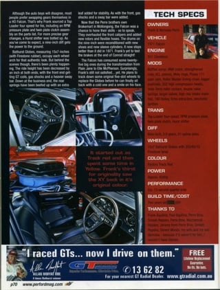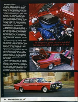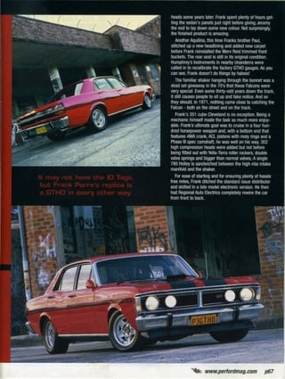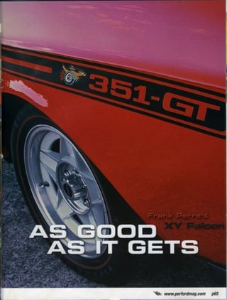 Immaculate 1971 Ph. 3 replica. Featured in Ford Performance Magazine. Factory Track red XY featuring WIND BACK SUNROOF, black trim, full GT dash, 400 HP 4V 351 Cleveland, genuine metal skaker with flap, Ph. 111 Vacuum tank, finned rear disk brakes, rear sway bar, 4 speed top loader, 9" and 15 x 7" Globes. Signed by Allan Moffat. Woolongong NSW car.